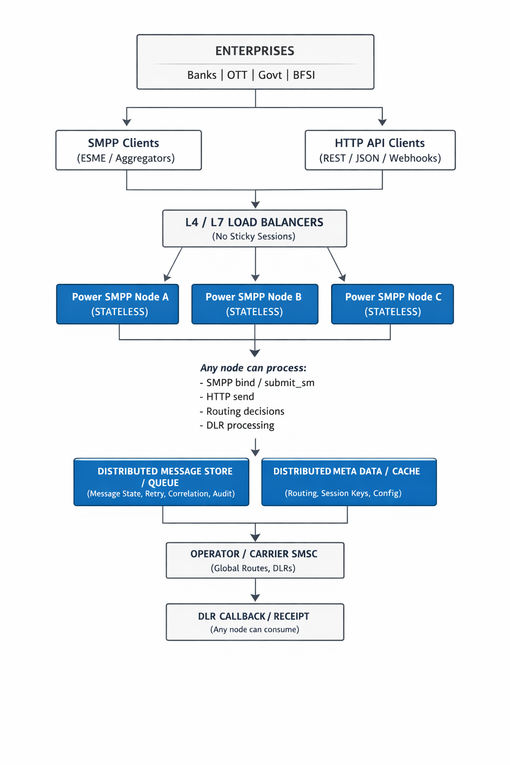 Yet, despite these mandates, very few SMSC or SMPP platforms truly deliver stateless, distributed high availability. The reason is simple: achieving this across multiple telecom protocols and CPaaS components is architecturally complex.